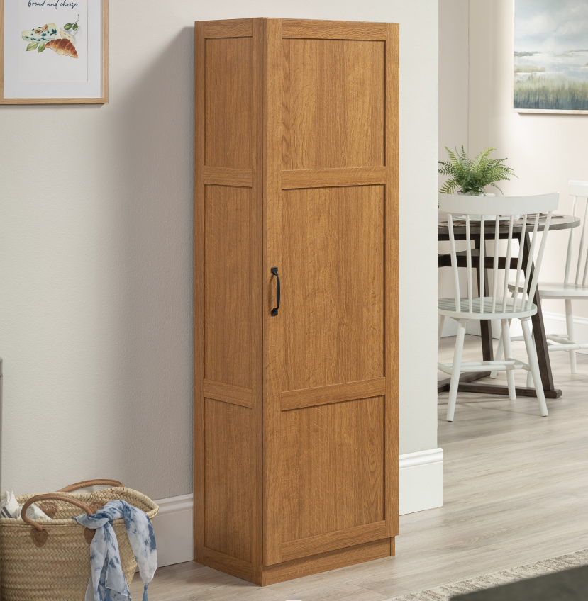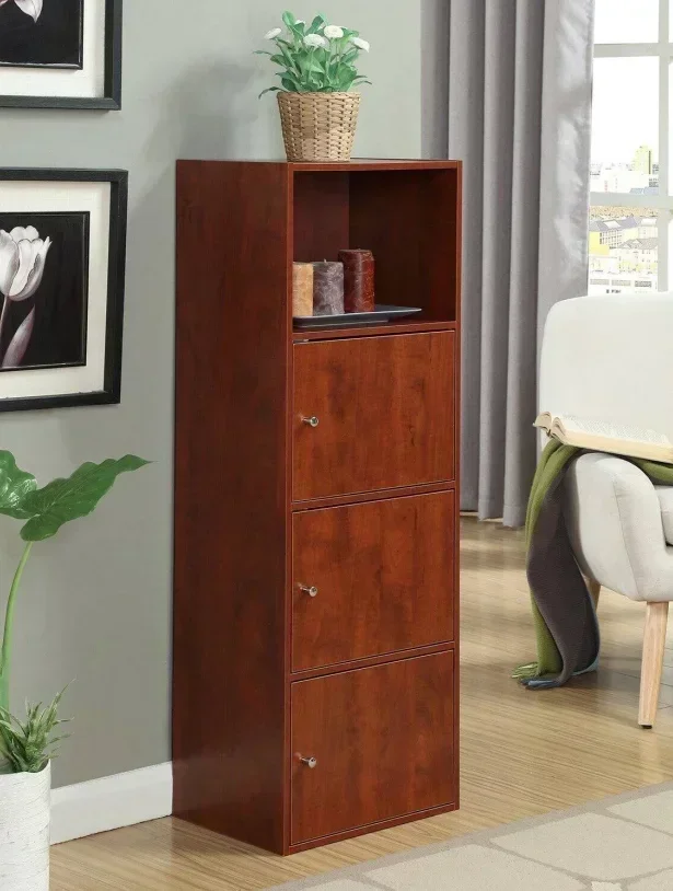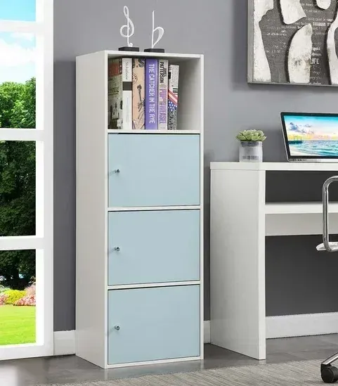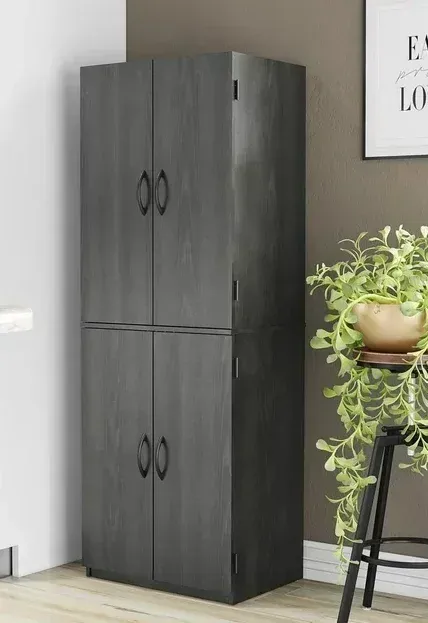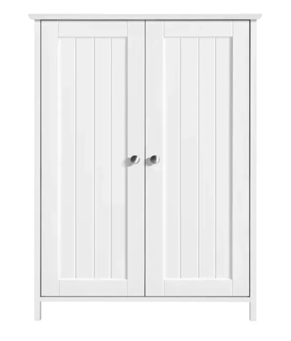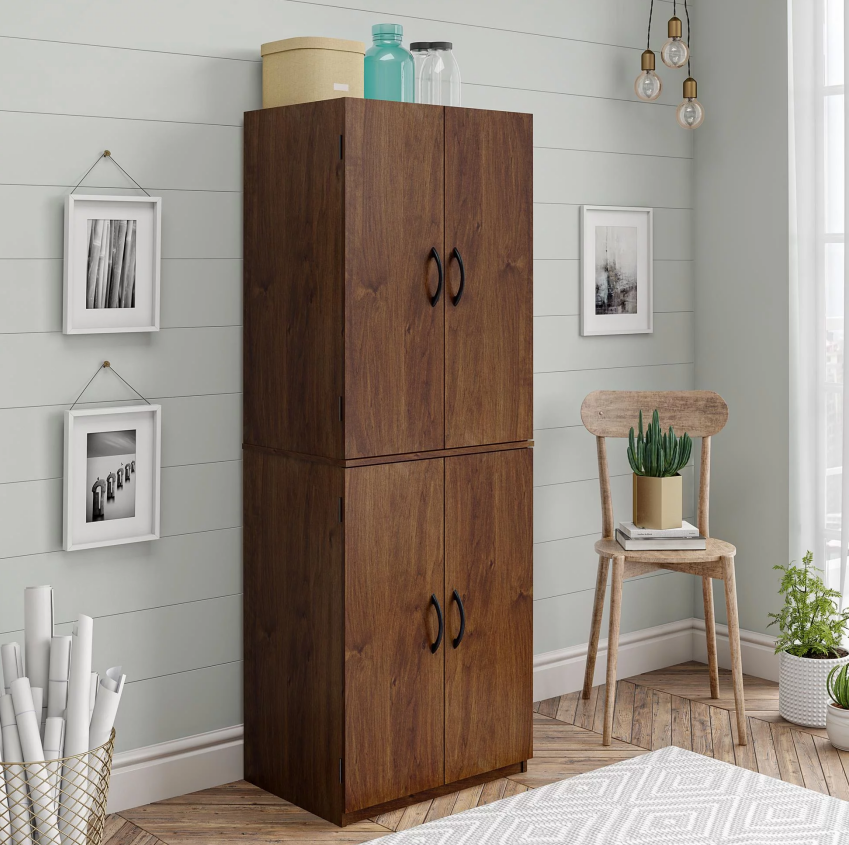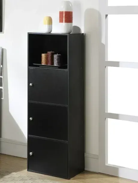 Behind 2 doors are 4 shelves (3 adjustable) to keep items organized from office supplies to nonperishable foods and extra linens