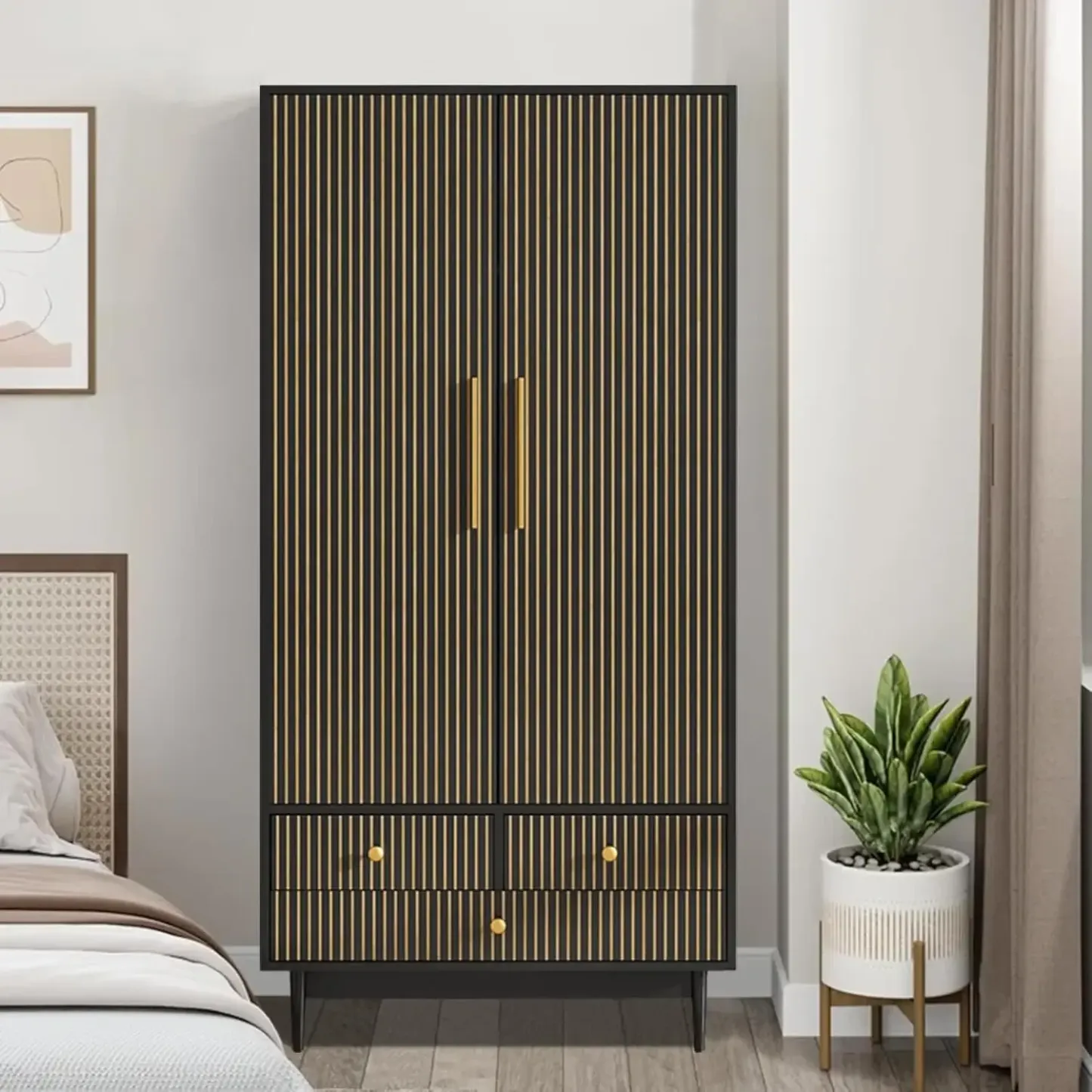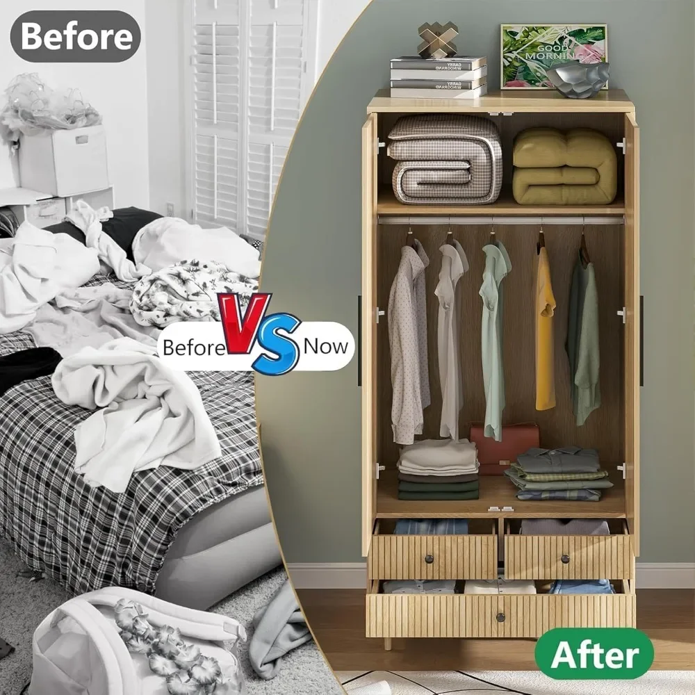 - 【LARGE CAPACITY WARDROBE】Give your room a new look with use our large capacity double door wardrobes! The large space of this wardrobe provides you with ample storage space for your clothes and belongings.The detachable hanging rod provides convenient length hanging space, which is perfect for longer clothes such as dresses, suits and coats.The large partition inside the cabinet doors can store bedding. The 3 spacious drawers at the bottom can store socks,underwear and personal items.
